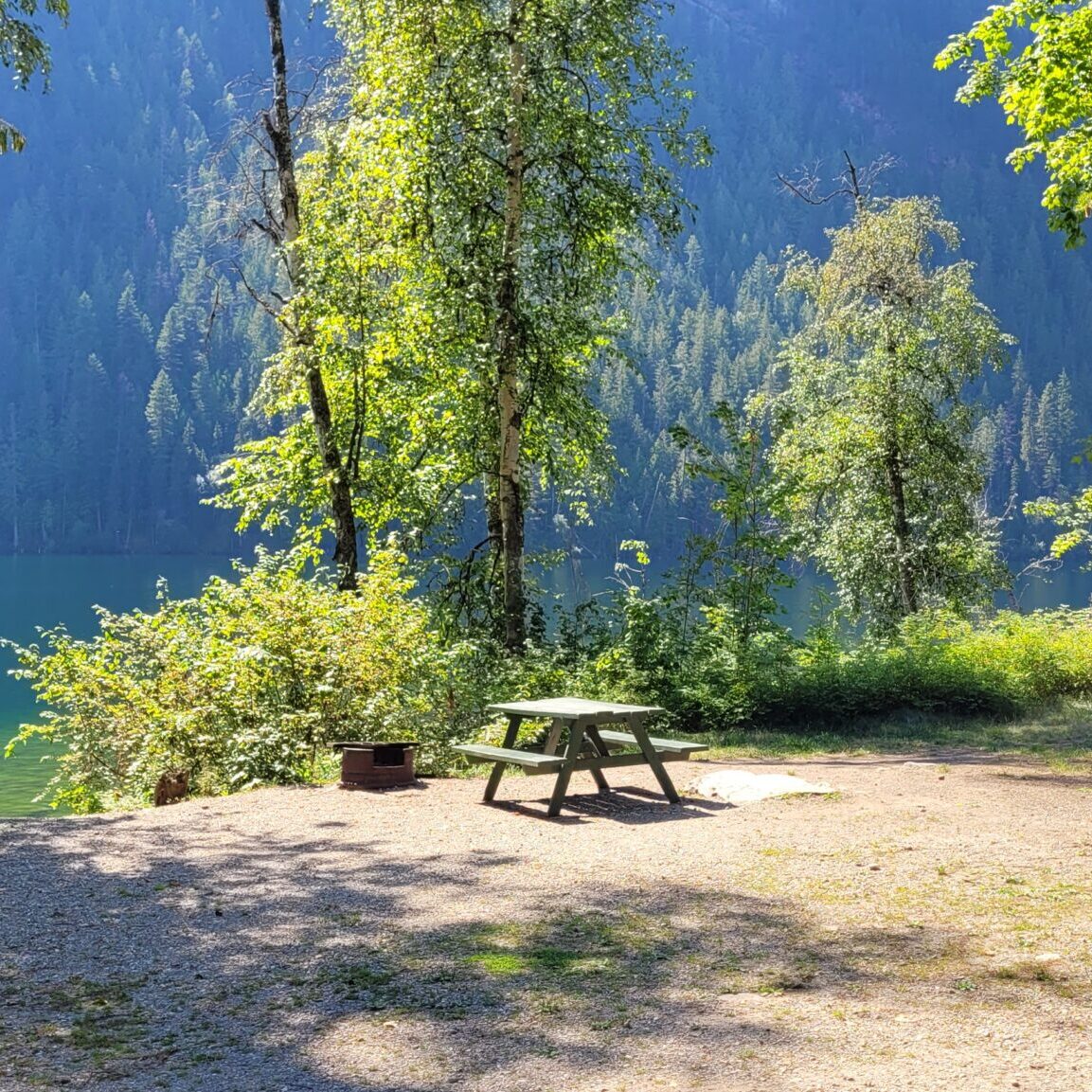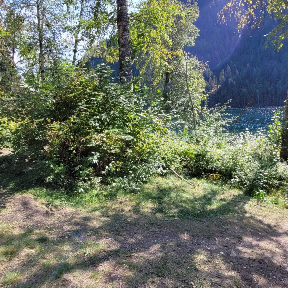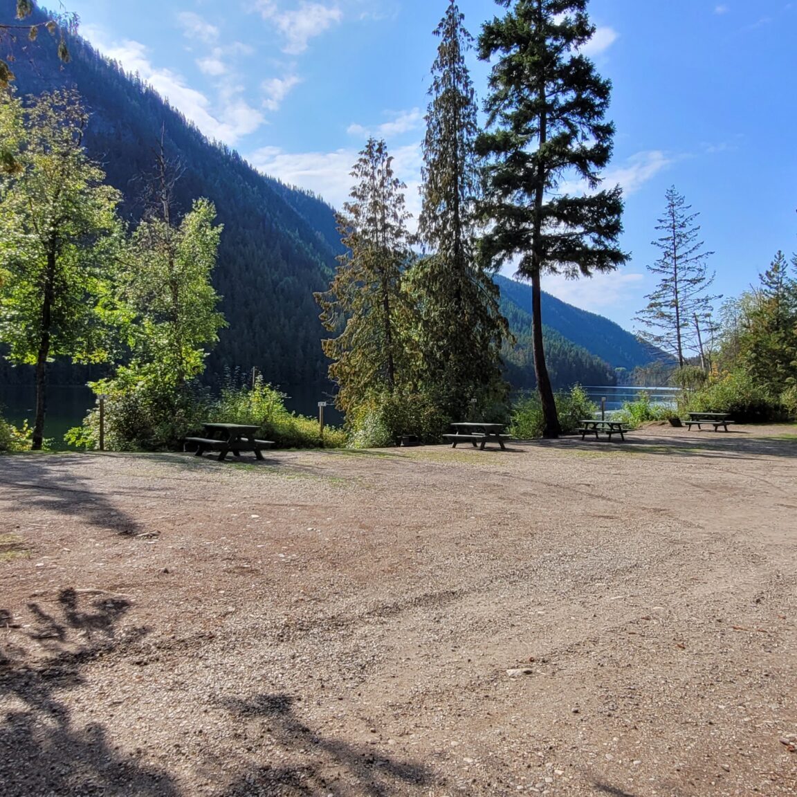 Welcome to the forest! Everywhere you look there’s greenery but none of it impedes enjoying Site D where the ground is level and you’ll still see the lake sparkle between the tree trunks.