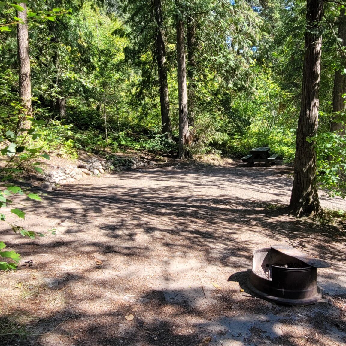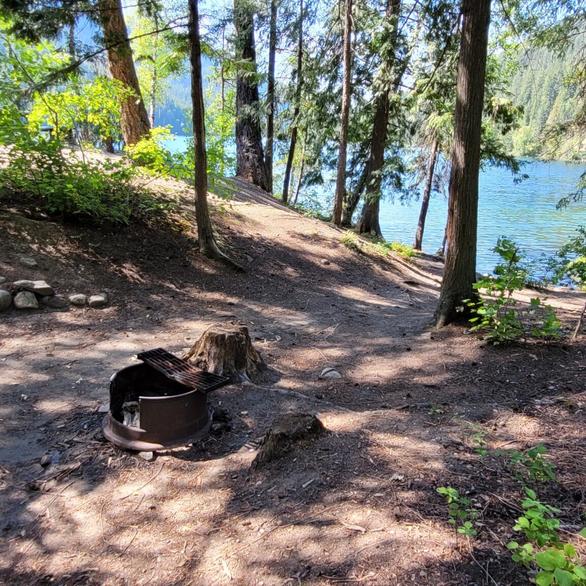 Site 12 is a large 16’ deep x 48’ wide campsite in the Cedar trees opposite the water with room for two small families to camp together for the same price as a single site! Campsite 12 has flat level parking for a camper van/ truck camper and a flat tenting site on the other side of a shared campfire pit. There is parking for two vehicles on the slope up to the site. Campsite 12 is located near to the lower campground outhouses and it’s a short walk to the main water access path between Campsites 4 and 5.