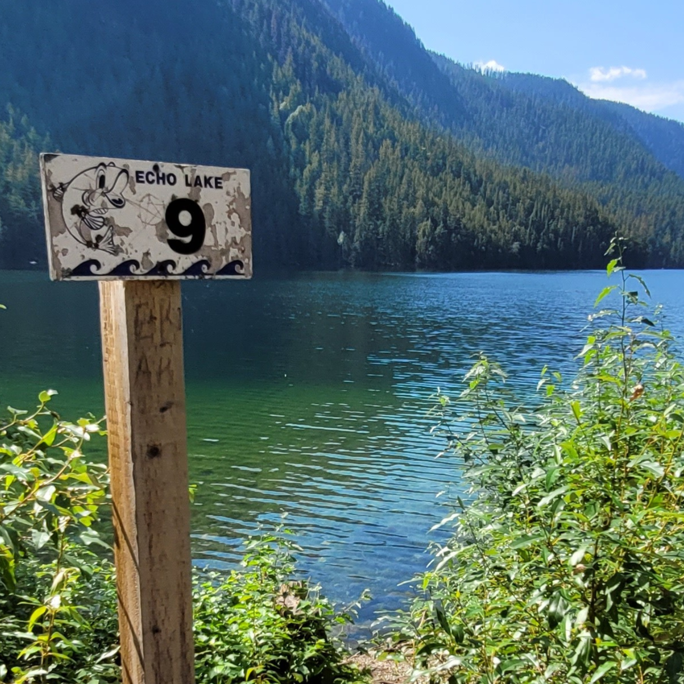 Our most popular tenting site with the best sunset view down Echo Lake is perched on a small hill at the end of Campground 1. A flat, level hilltop with campfire pit and picnic table and room to set up awaits you. Experienced drivers with a small, light trailer, small camper van or truck with camper attached are also welcomed to book this site. Sorry, no large or heavy trailers are permitted on this site to minimize erosion. A downhill path takes you to the shoreline.